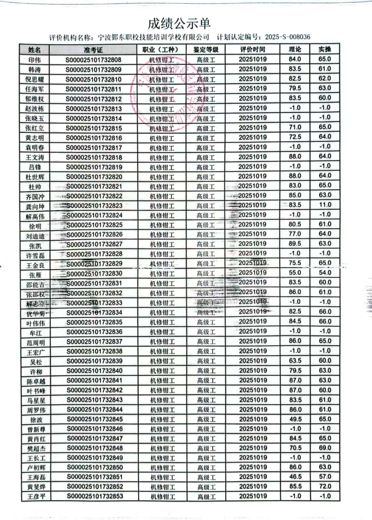 10月19日职业技能等级认定机修钳工高级成绩公示(杭州湾)