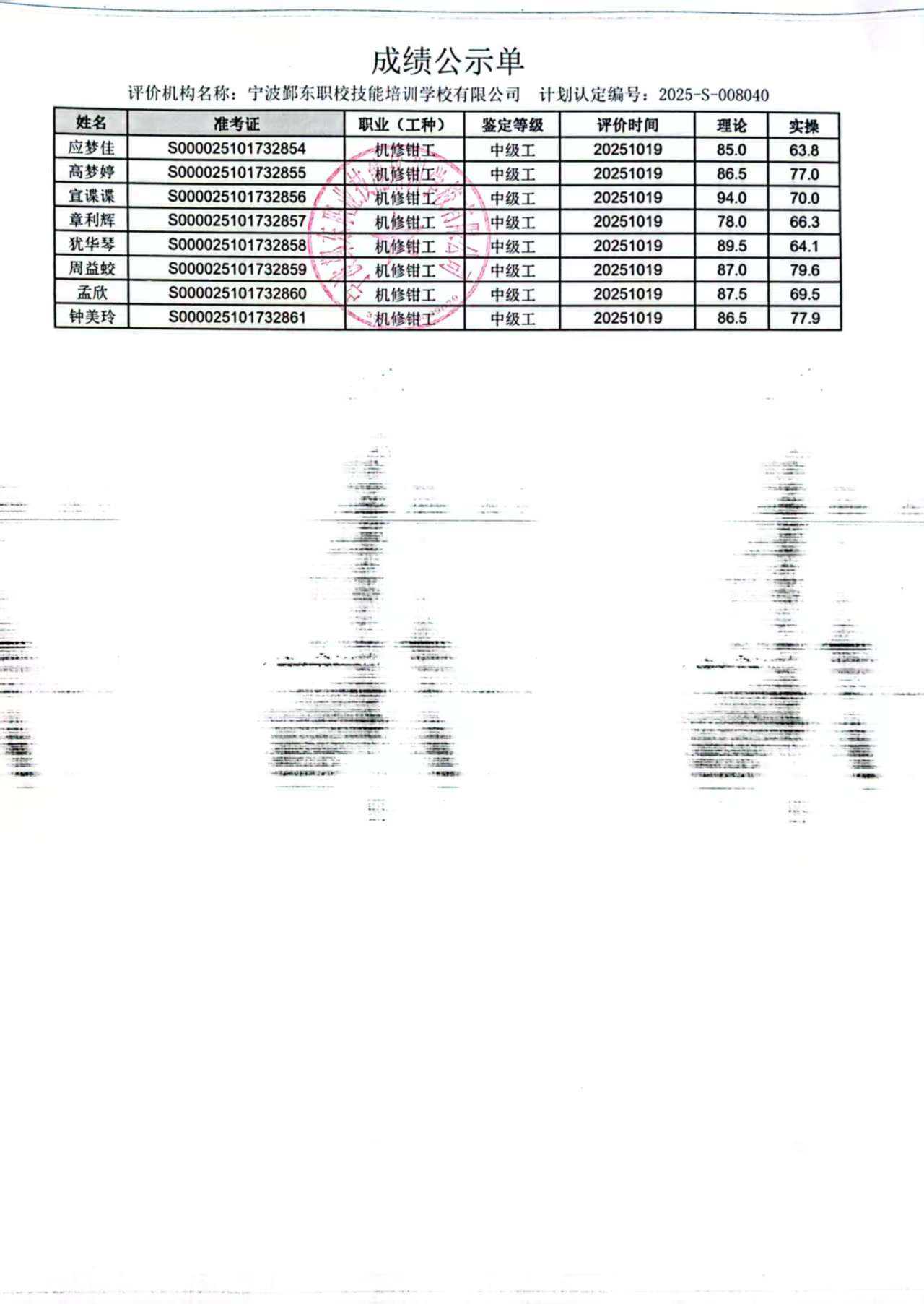 10月19日职业技能等级认定机修钳工中级成绩公示(杭州湾)