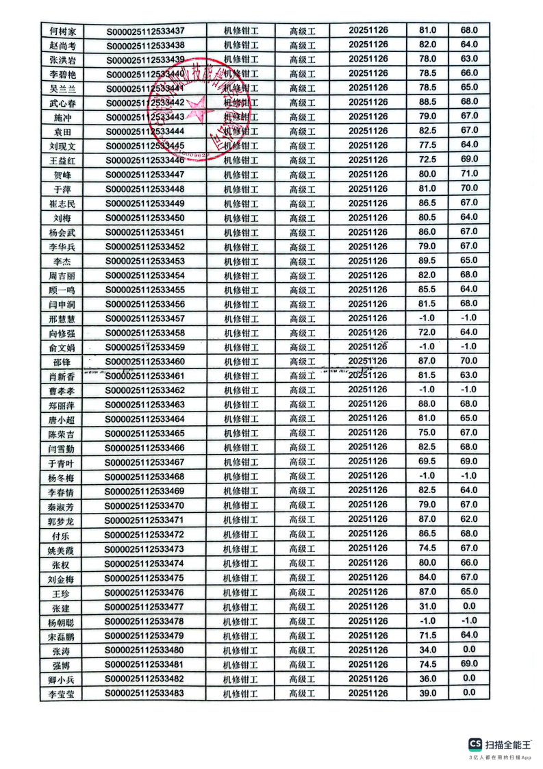 11月26日职业技能等级认定机修钳工高级成绩公示(北仑)