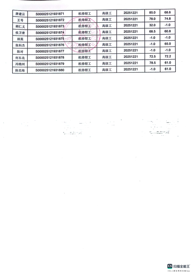 12月21日职业技能等级认定机修钳工高级成绩公示