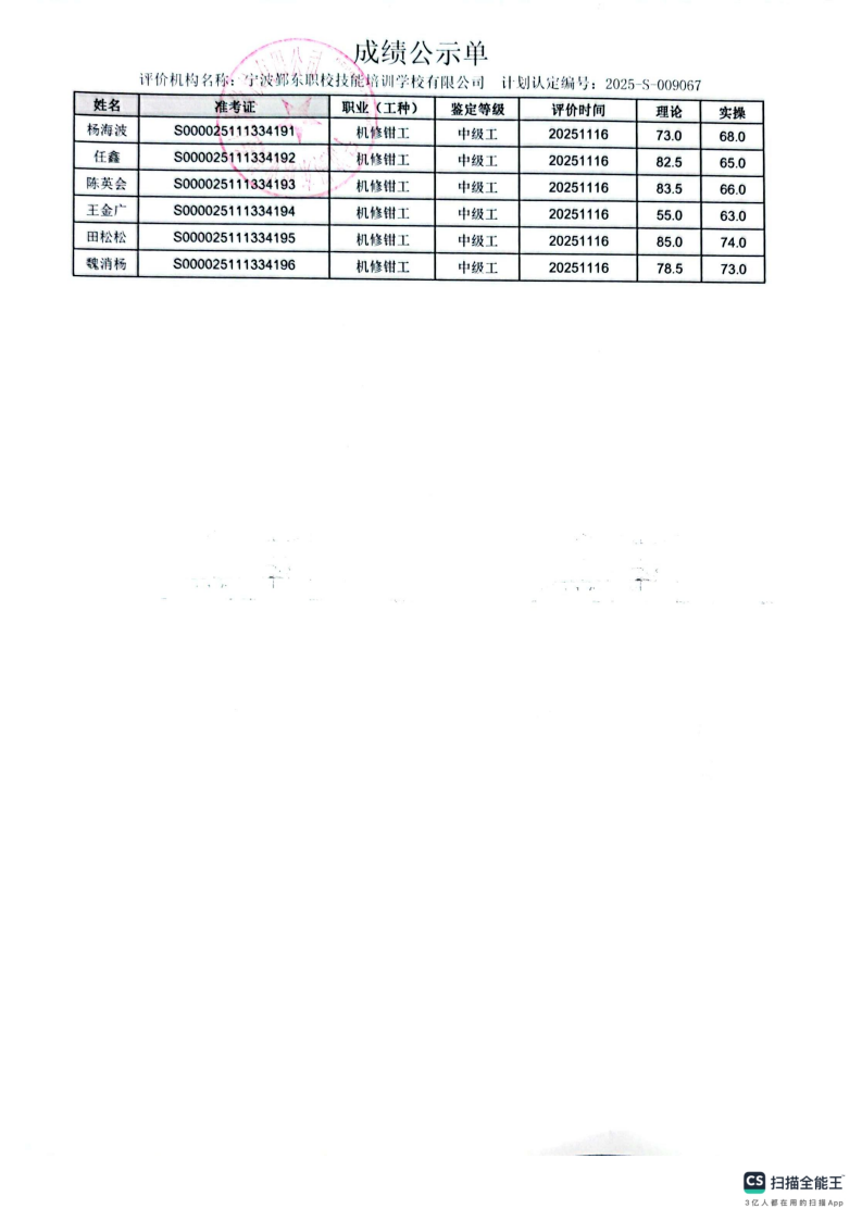 11月16日职业技能等级认定机修钳工中级成绩公示(慈溪职高)