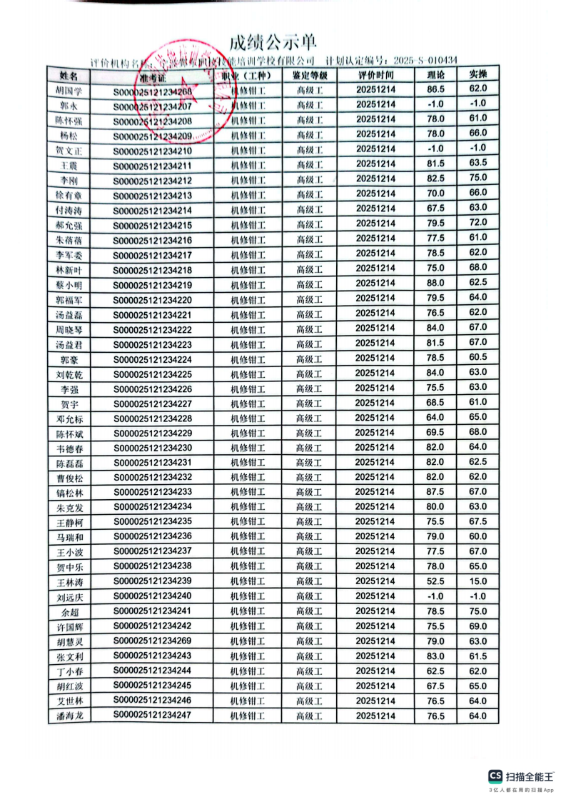 12月14日职业技能等级认定机修钳工高级成绩公示(杭州湾)