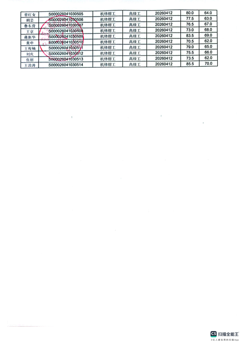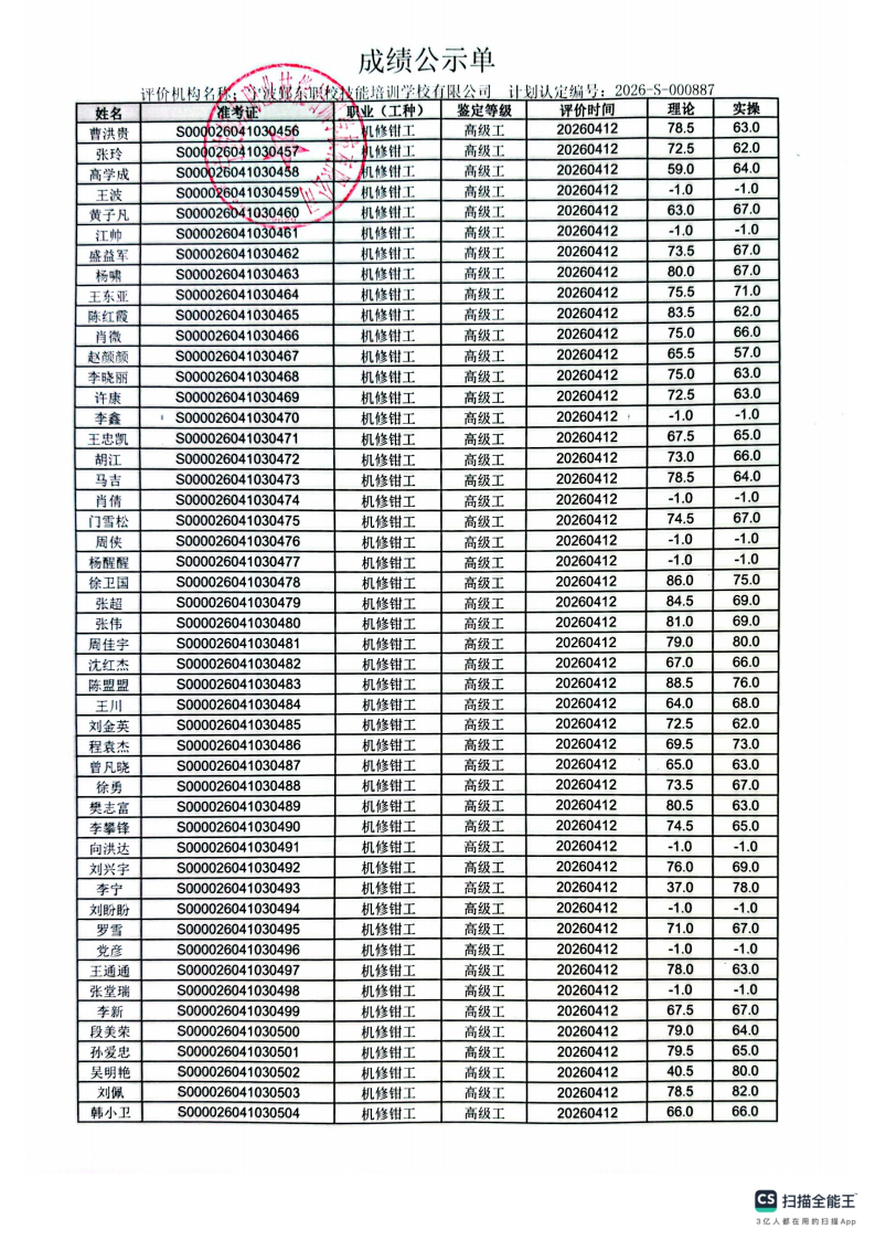 2026年4月12日职业技能等级认定机修钳工高级成绩公示(北仑)