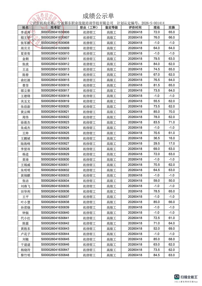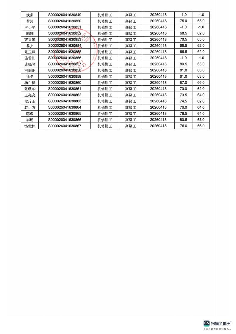2026年4月18日职业技能等级认定机修钳工高级成绩公示(鄞东)