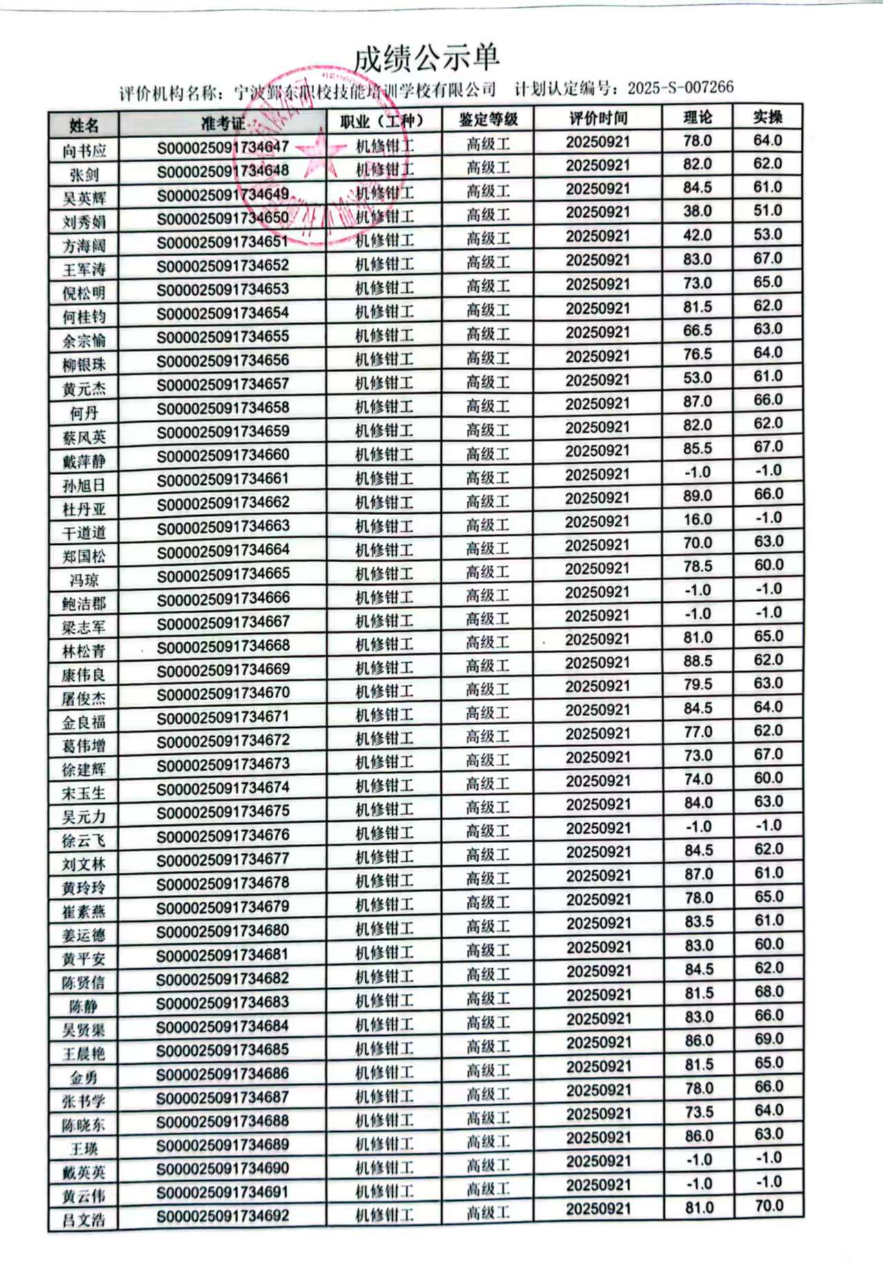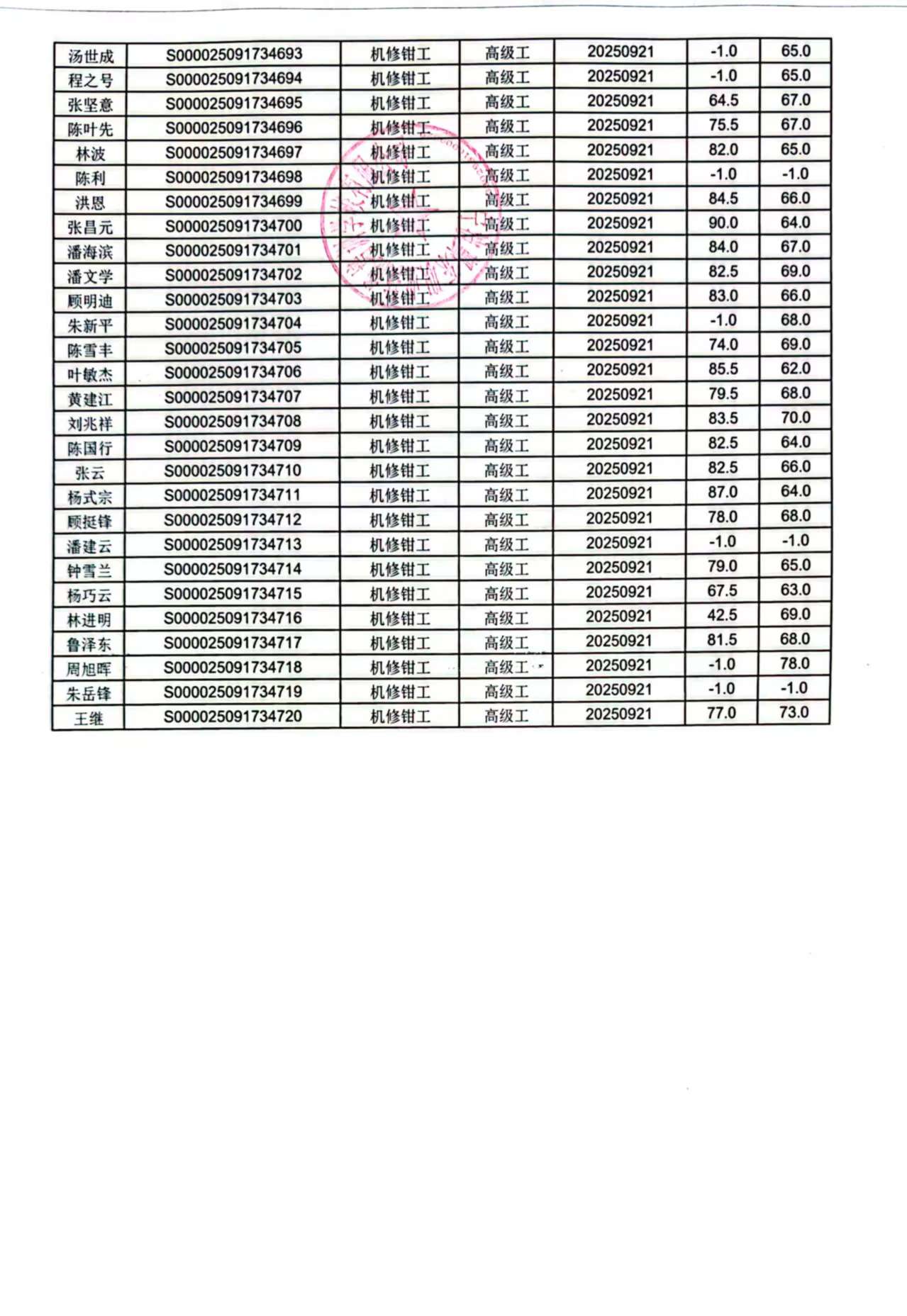 9月21日职业技能等级认定机修钳工高级成绩公示(豪兴)
