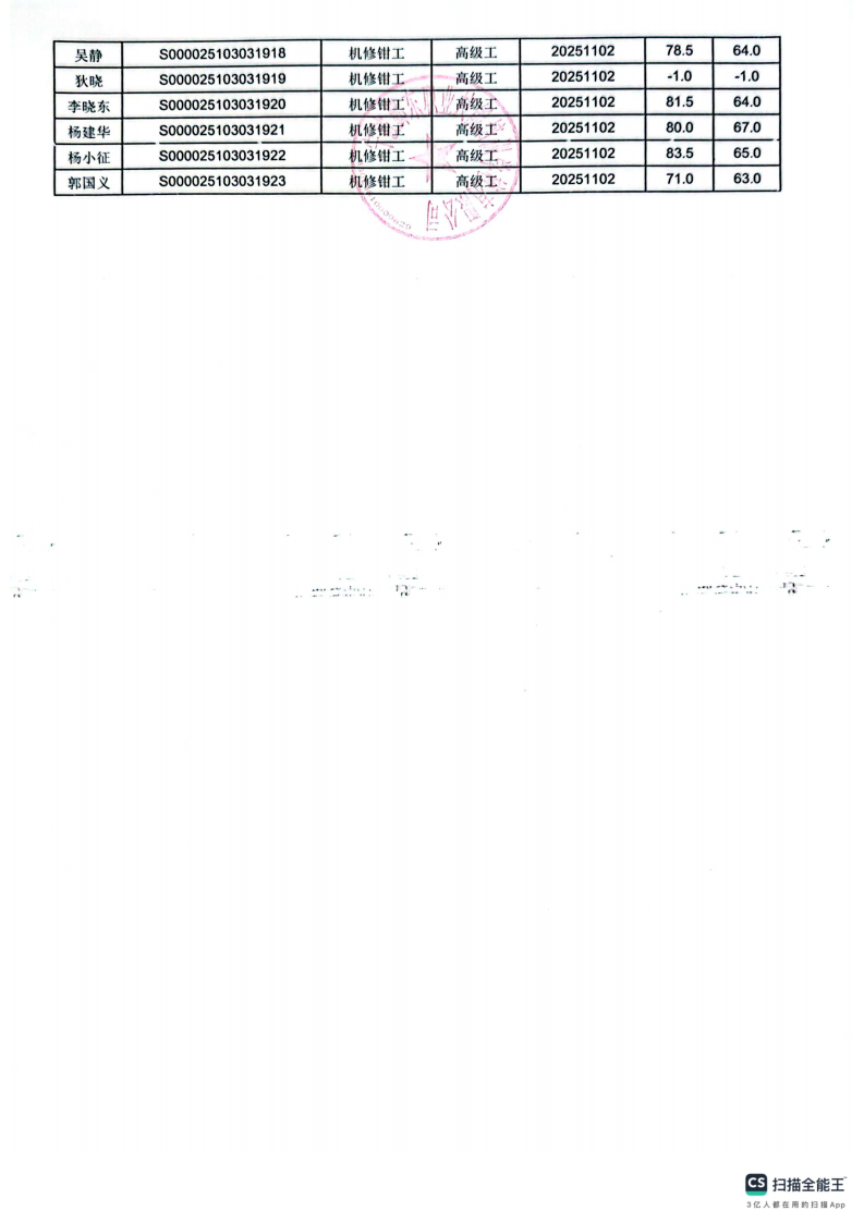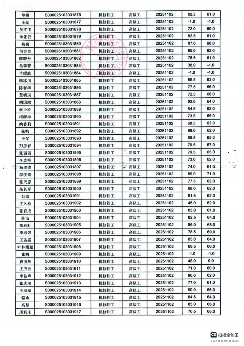 11月2日职业技能等级认定机修钳工高级成绩公示