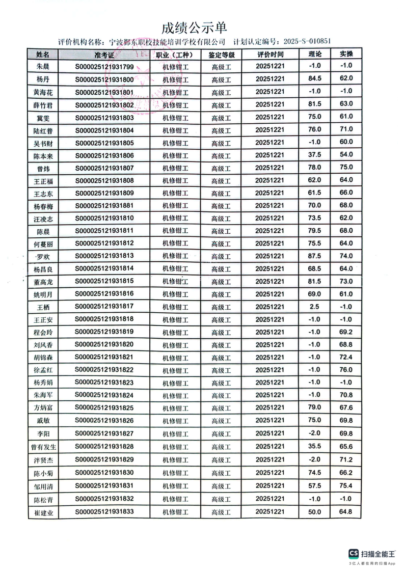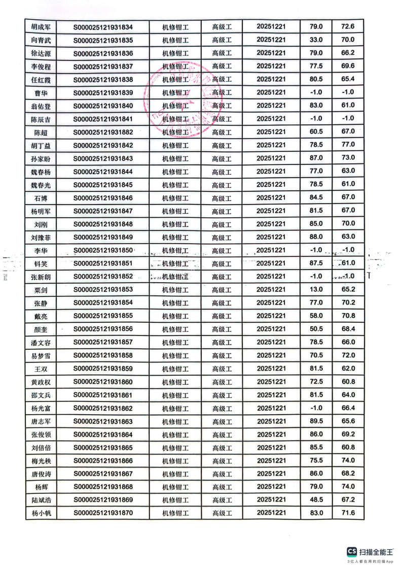 12月21日职业技能等级认定机修钳工高级成绩公示