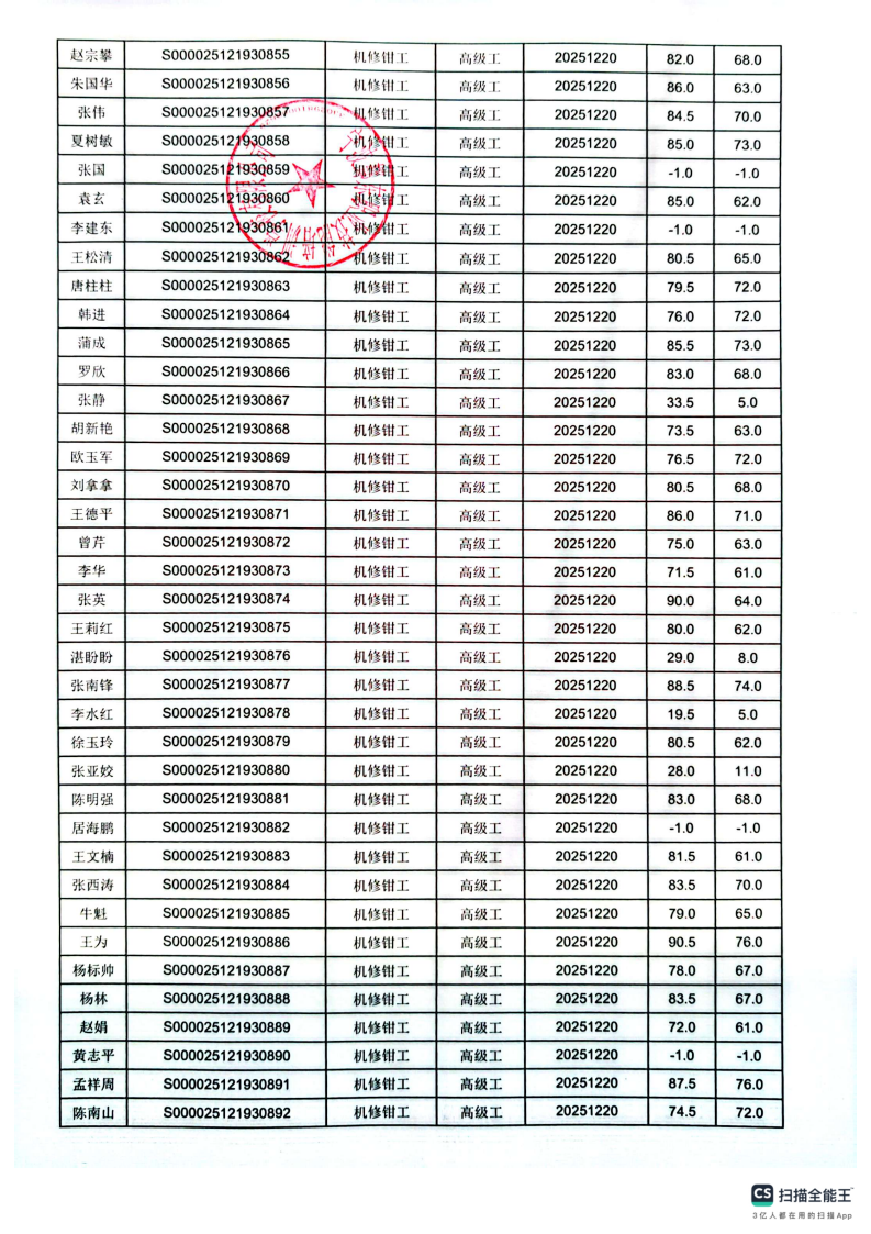 12月20日职业技能等级认定机修钳工高级成绩公示(北仑)