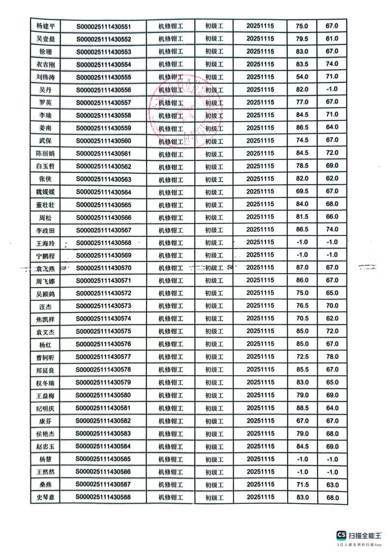 11月15日职业技能等级认定机修钳工初级成绩公示